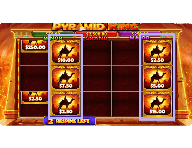 Money Respin Feature. In Pyramid King Online, there is a Money symbol featuring camels. Landing 6 of these symbols on the reels triggers an alternate super game. During this round, only Money symbols remain on the reels, and the player is awarded 3 respins. The more symbols the player manages to land during this super game, the bigger the prize that will be awarded at the end.
