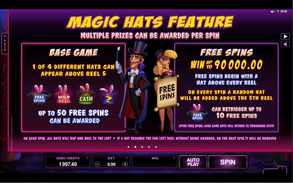 The Rabbit in the Hat Slot has a Wild symbol as well. It is an inverted black cylinder with a purple ribbon and the word: ”WILD” flickering over it. There are extra four cylinders: the ”Rosy” one will make a whole reel really wild and the ”spin” will be allowed to re-evaluated; the ”Bluish” one will present you that number of ”spins” that will be visible on this cylinder. (the biggest ”gift” = 50!); the ”Green” cylinder will award you a prize that is based on your overall stake and the ”Violet” cylinder in this slot machine will surprise you with one of the previously noted features.