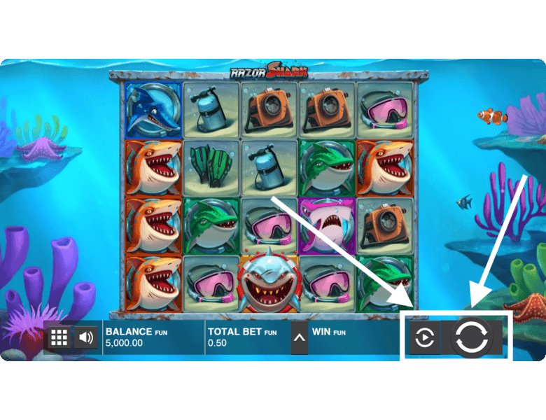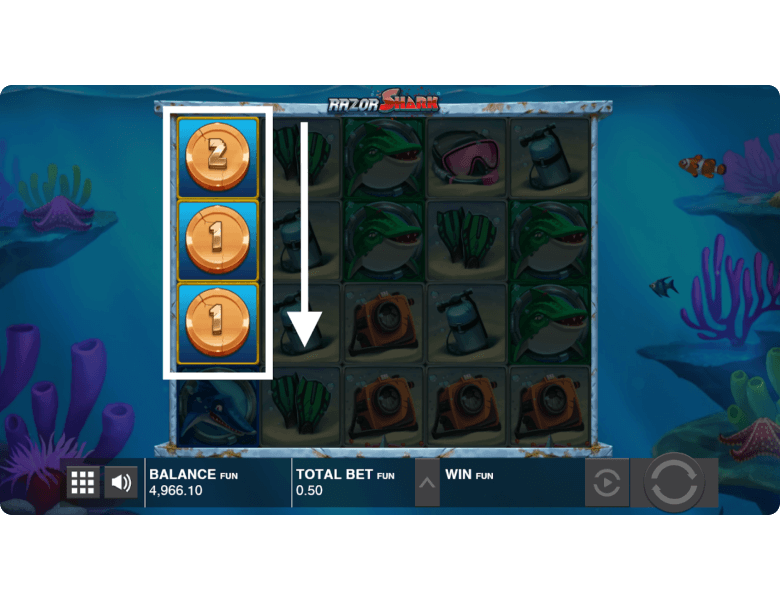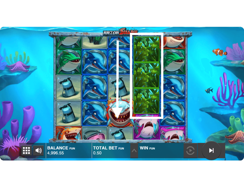 Razor Reveal Feature. If the seaweed reveals golden shark symbols, this option is triggered. Thanks to this bonus, the player can receive coin symbols with random values, which will be credited as an instant win. Additionally, the shark can transform into a Scatter, which usually triggers or extends the free spins round.