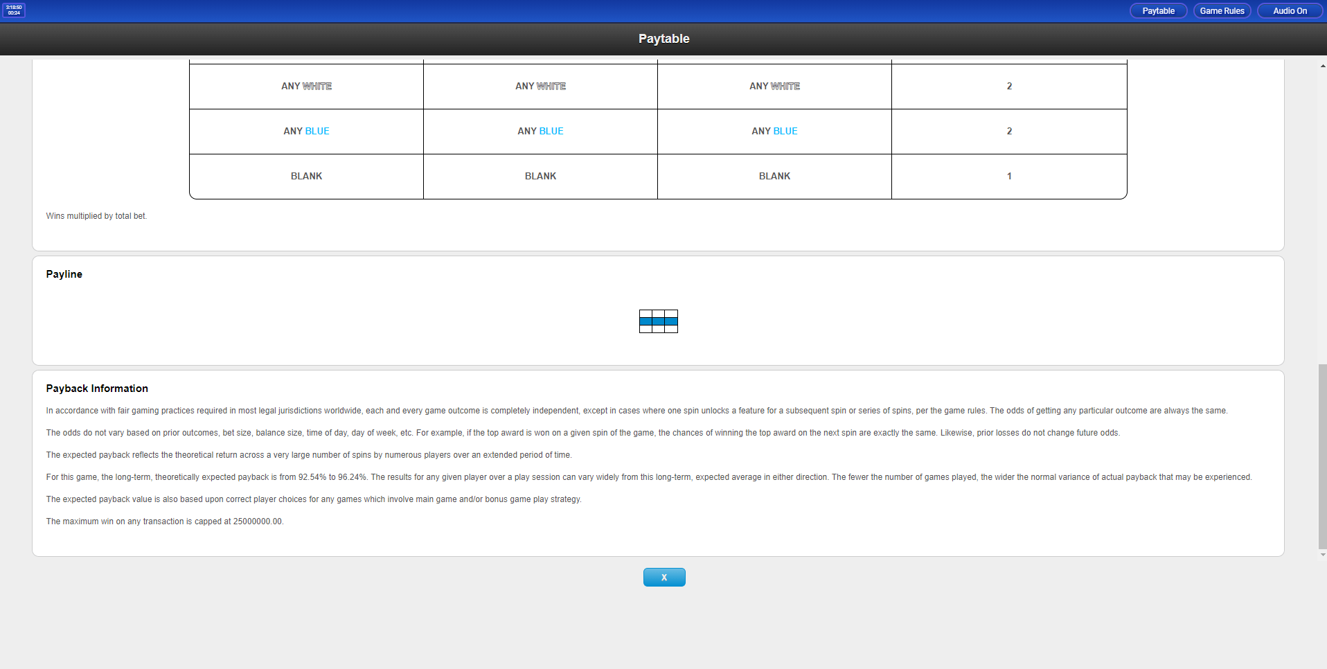 Red White and Blue has a fixed RTP of 93.98% in real money play, which puts it below most modern video slot RTPs.
