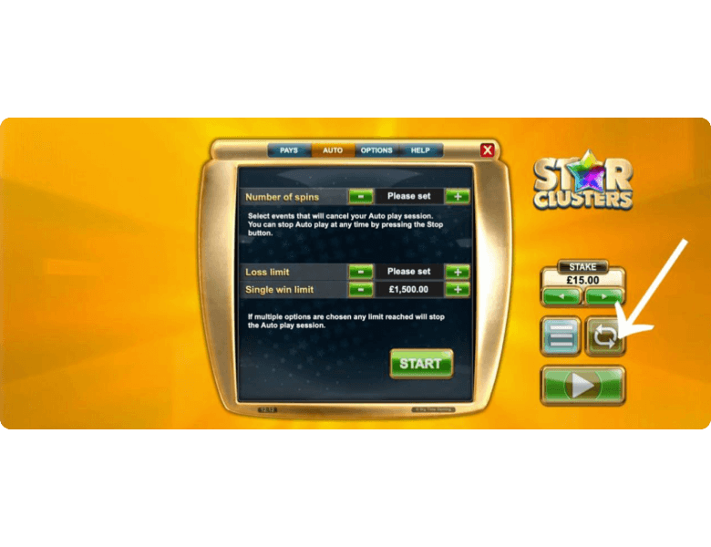 You can start the game in two ways: manual or automatic spinning. In the first case, you need to click the green Play button and repeat this action every round. In the second case, simply click the button with the circular arrows — this is the Autoplay mode, which allows you to choose up to 100 automatic spins. You can also set win and loss limits to control the autoplay feature.
