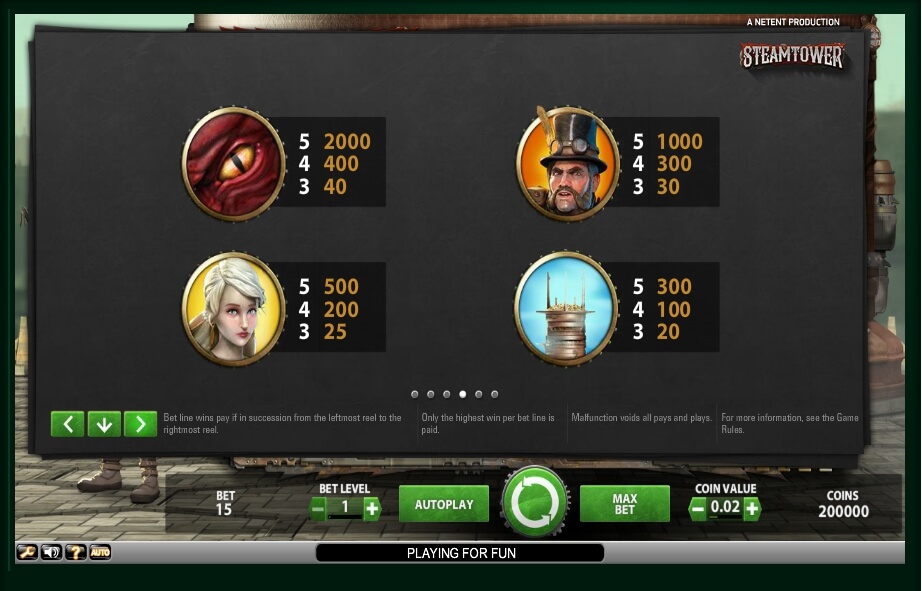If you have the luck to see the complete reel covered with Stacked Wild during the main game, then ten free spins will become available to you. In this, the Steam Tower there are 16 floors by which you shall rise, starting with the first. Each floor has a multiplier (since a twain on the 1st and finishing with the seven after achievement of the 16th), which is applied on a scoring of each free spin.