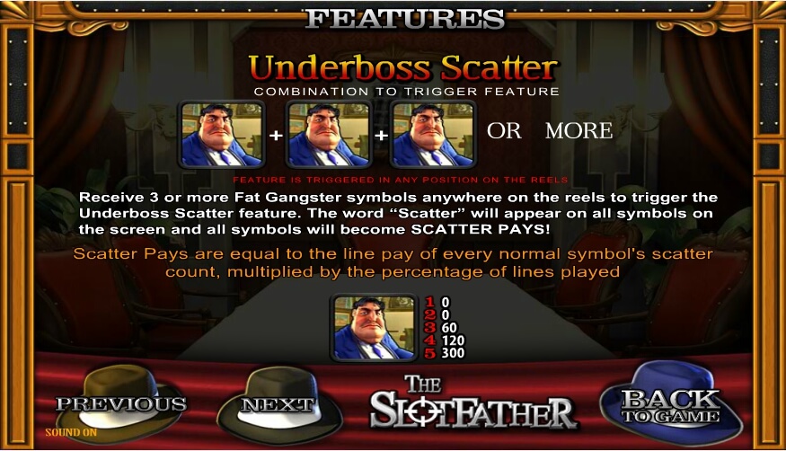 There is also the scatter symbol in this game. When 3 or more Underboss symbols appear on the screen, the high-paying symbols of different types will be replaced by the same Scatter symbol. The more of such symbols are in game, the bigger the prize will be.