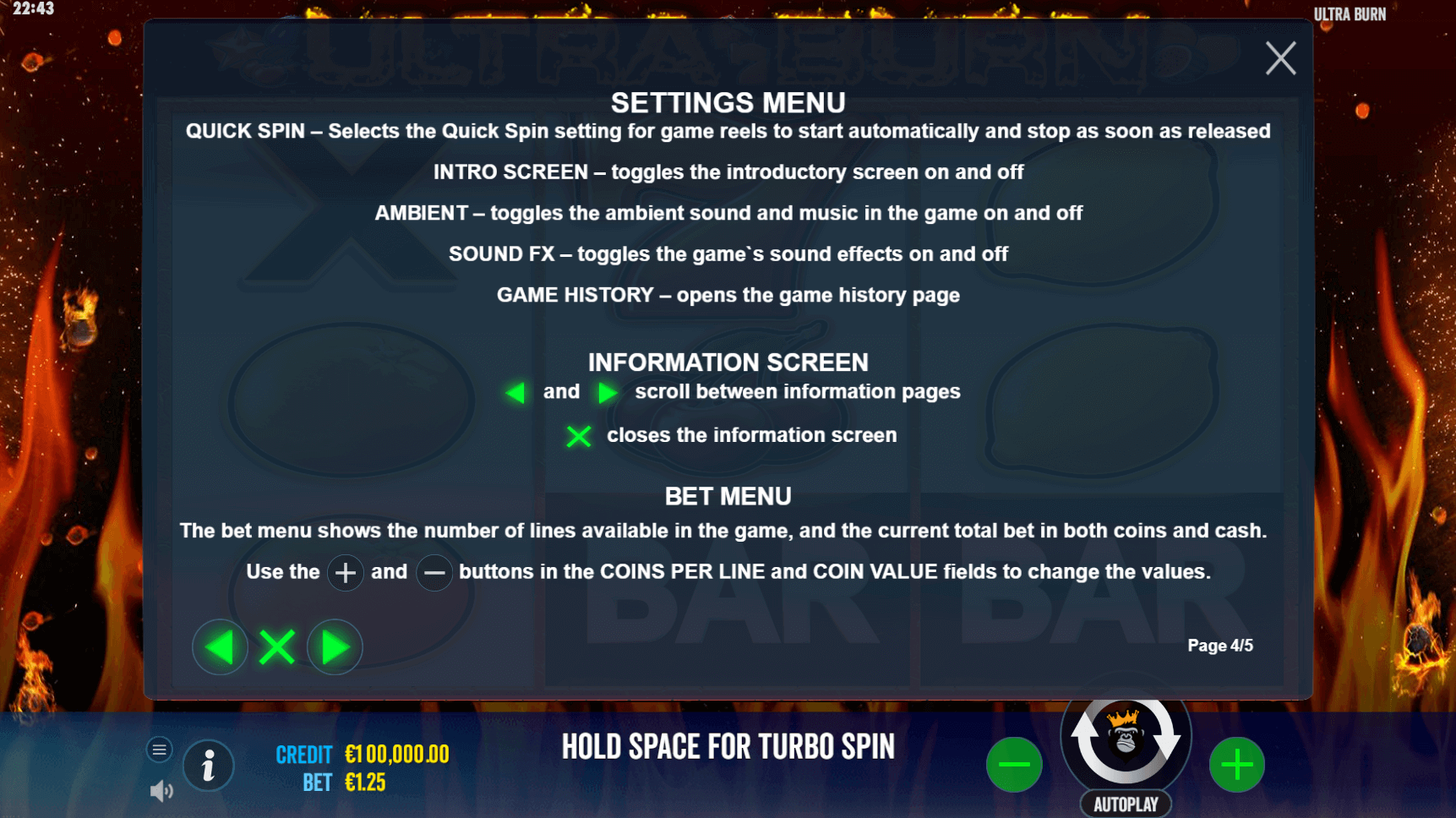 There are no expanding wilds or respin rounds here—unlike Ultra Hold and Spin, which adds Money Symbols and a Hold & Respin bonus. Ultra Burn stays firmly in old-school territory, focused entirely on quick, uninterrupted spins.