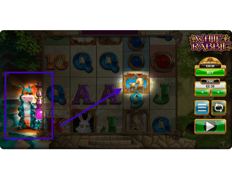 On any spin in White Rabbit—whether playing for real money or for fun—this random feature can activate. The caterpillar sleeping to the left of the reels releases smoky rings across the grid. As a result, up to four Bonus Wild symbols can appear. These unique symbols don’t just help complete winning combinations; they also multiply the payout by x2 or x3. This feature is available only in the base game.