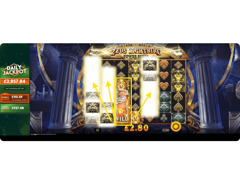 Wild. The mighty Zeus himself takes on the role of the Wild in Zeus Lightning Power Reels. This symbol can land on any reel and always covers three rows at once. Its main purpose is to substitute for paying symbols, helping you form winning combinations across multiple paylines at the same time. But Zeus doesn’t stop there — whenever he acts as a Wild, he also triggers an additional feature, both in the base game and during free spins.